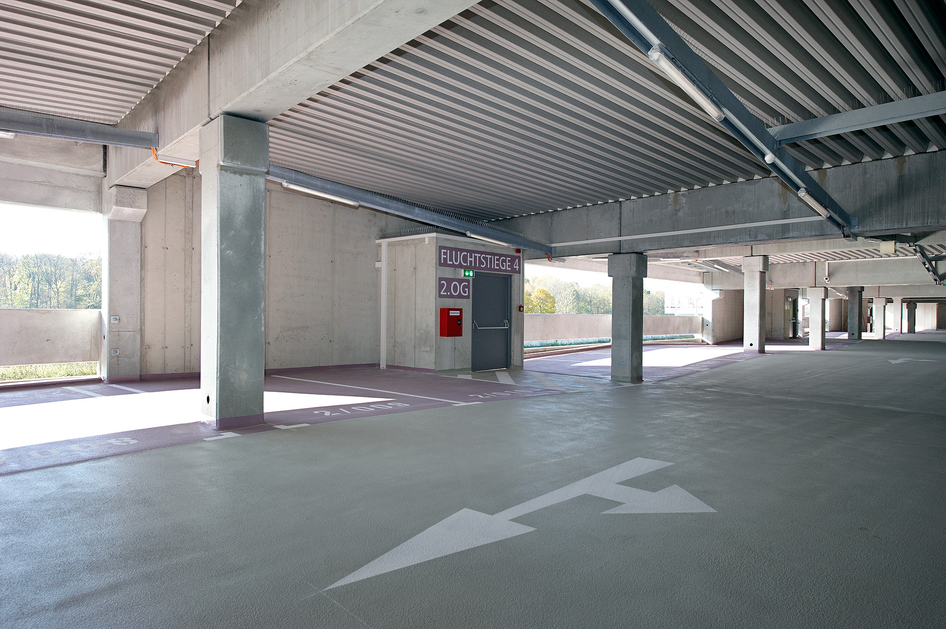 Schwierige Gründungsverhältnisse (Auschwemmland) sowie der Bedarf einer kostengünstigen und sehr schnell zu errichtenden Gebäudekonstruktion führten, nach eingehenden Variantenstudien, zu einem speziellen Tragkonzept das einerseits mit einer Untergrundverbesserung (Betonstopfsäulen, Rütteldruckverdichtung) und andererseits mit einer sehr leichten und weit gespannten, somit auch funktional optimalen Deckenkonstruktion durch vorgespannte Hohldielen mit bewehrtem Aufbeton auf FT-Unterzügen und FT-Stützen, alle gestellten Erfordernisse optimal erfüllt. Der Bereich der Rampen sowie die 6 Stiegenhäuser wurden in Ortbetonbauweise hergestellt. Im Erdgeschoß gelangte ein straßenbaumäßiger Aufbau (Asphalt) zur Ausführung, die übrigen Geschoße wurden mit einer farblich gestalteten Betonbeschichtung versehen. Die oberste Parkebene ist überdacht. Es kam eine verzinkte Stahlträgerkonstruktion mit Trapezblech als Dachhaut zu Ausführung.